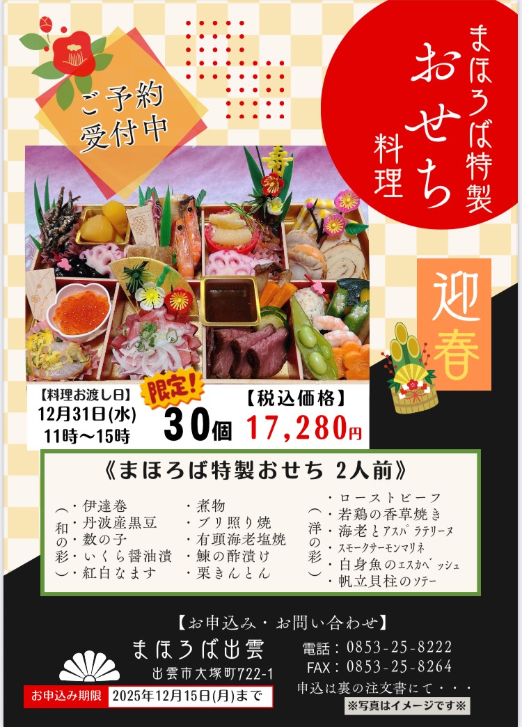 2026年まほろば特製おせちの注文予約開始のお知らせです🎍